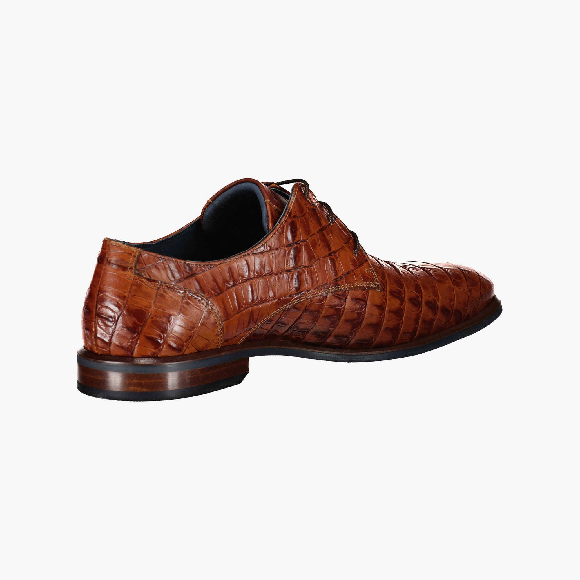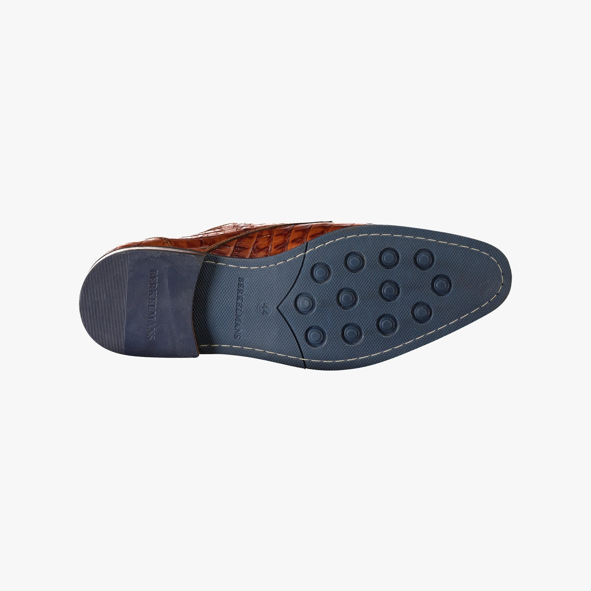 Lederen Berkelmans veterschoenen met all over motief en derby sluiting. De schoenen zijn voorzien van een rubberen loopzool, voor extra grip en minder snelle slijtage. De binnenzijde heeft een lederen voering en een uitneembare, schokdempende inlegzool. Bijgeleverd is een extra paar veters.